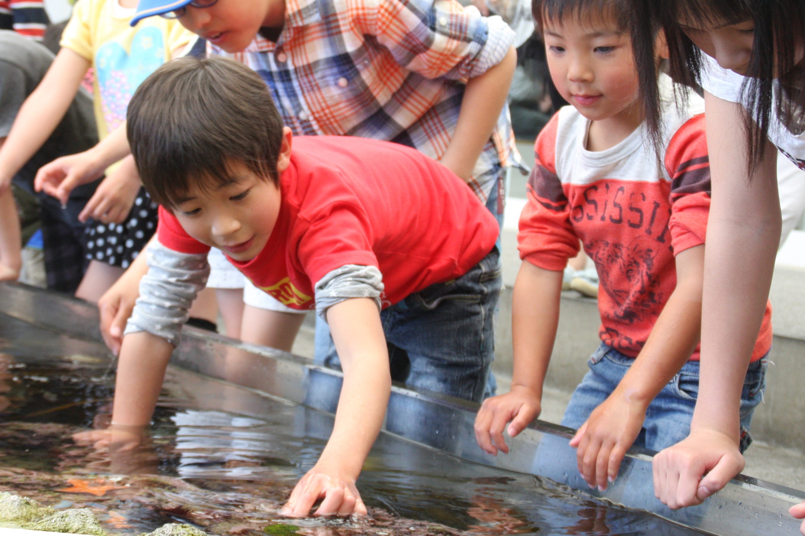 自然の磯を再現した巨大なロック・フィールド。ウニやヒトデにふれて、わからないことは飼育員へ聞いてみてください。