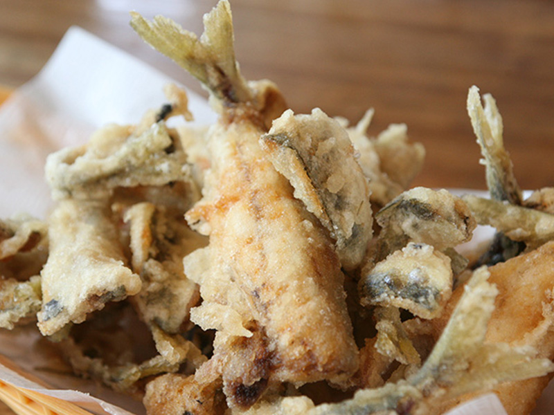 アツアツのアジの天ぷらを調理、提供いたします。ご一緒にドリンクもいかが?